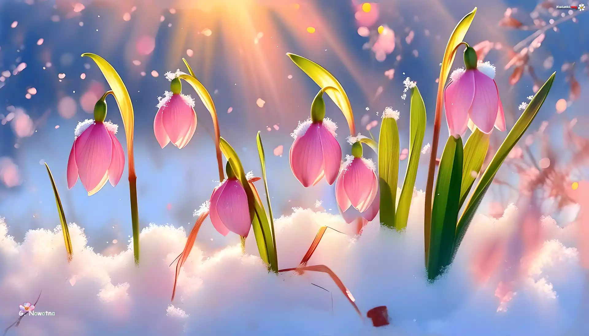 Różowe, Kwiaty, Grafika, Śnieg, Słońce - Zdjęcia
