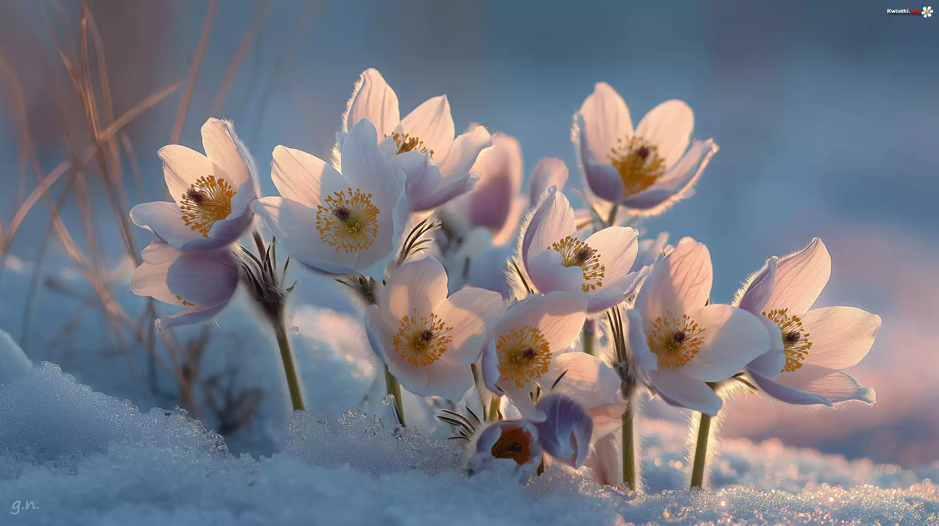 Sasanki, Kwiaty, Grafika AI, Śnieg - Zdjęcia