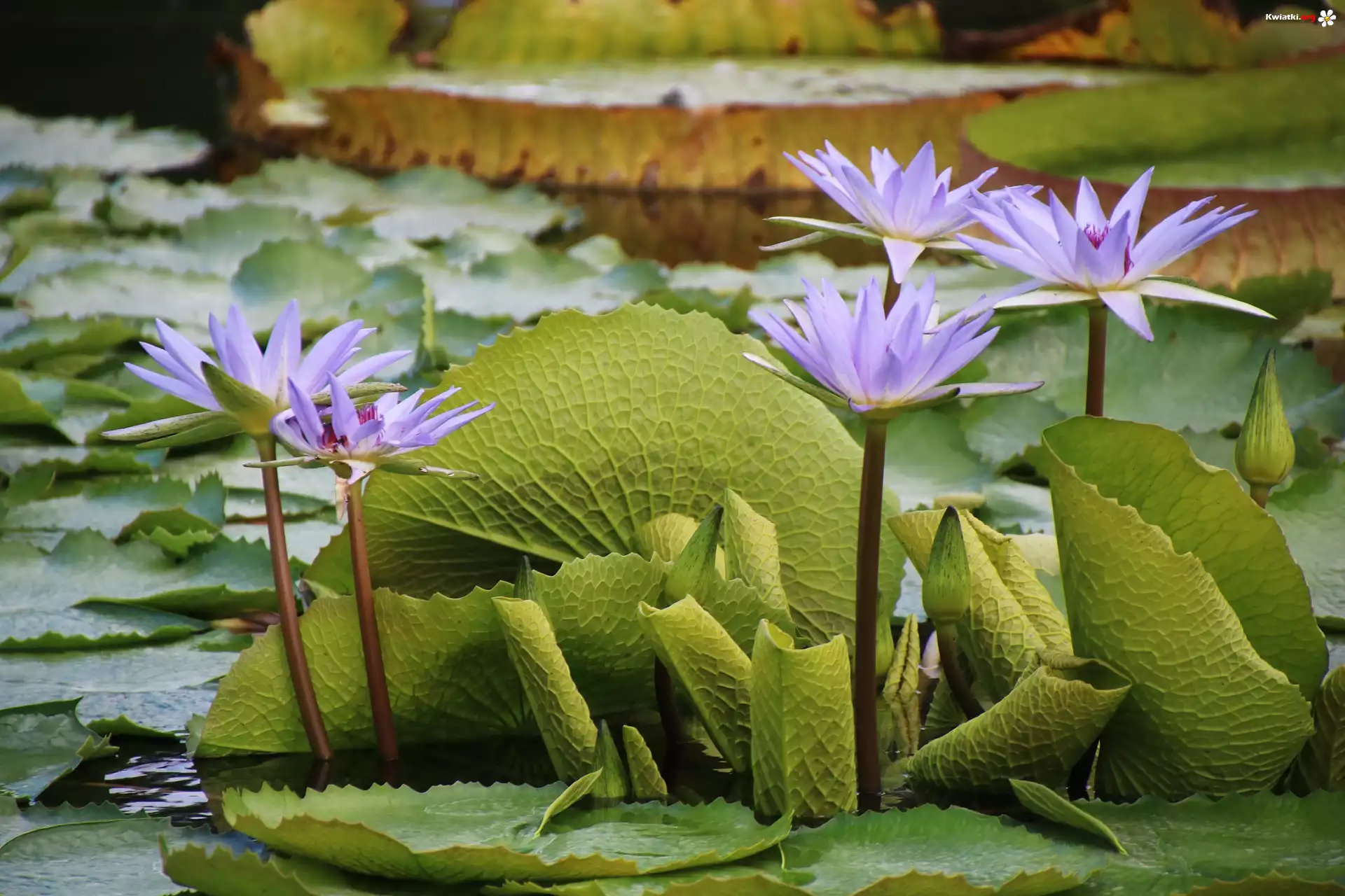 Kwiaty, Niebieskie, Lilie wodne, Grzybienie, Liście - Zdjęcia