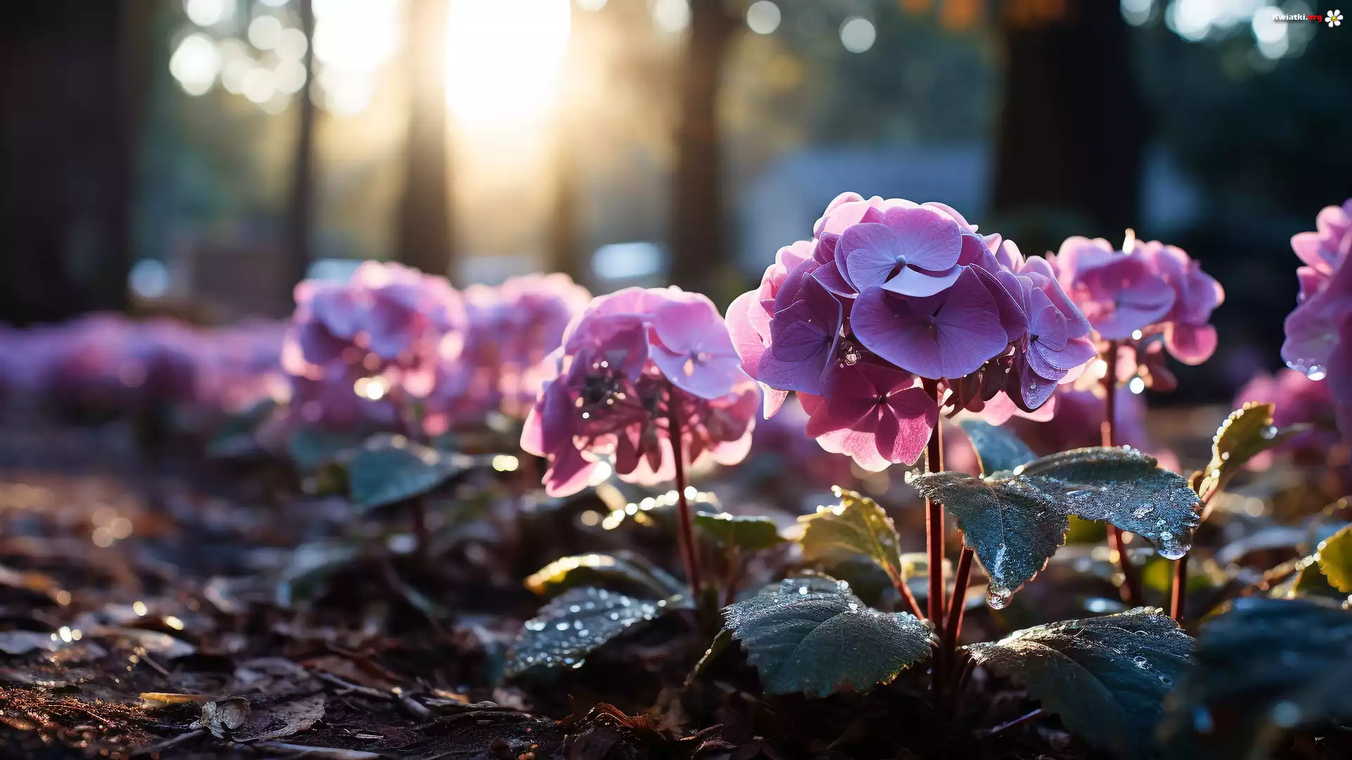 Kwiat Fioletowe, Kwiaty, Hortensje, Listki, Krople