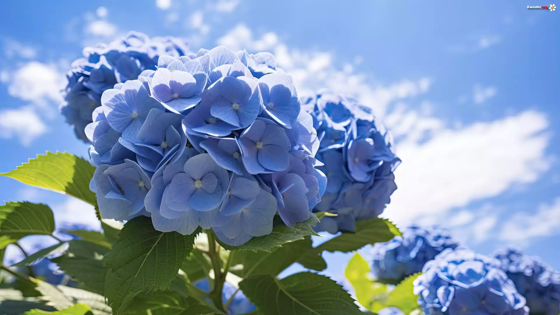 Niebieskie, Kwiaty, Hortensje, Listki, Niebo - Zdjęcia