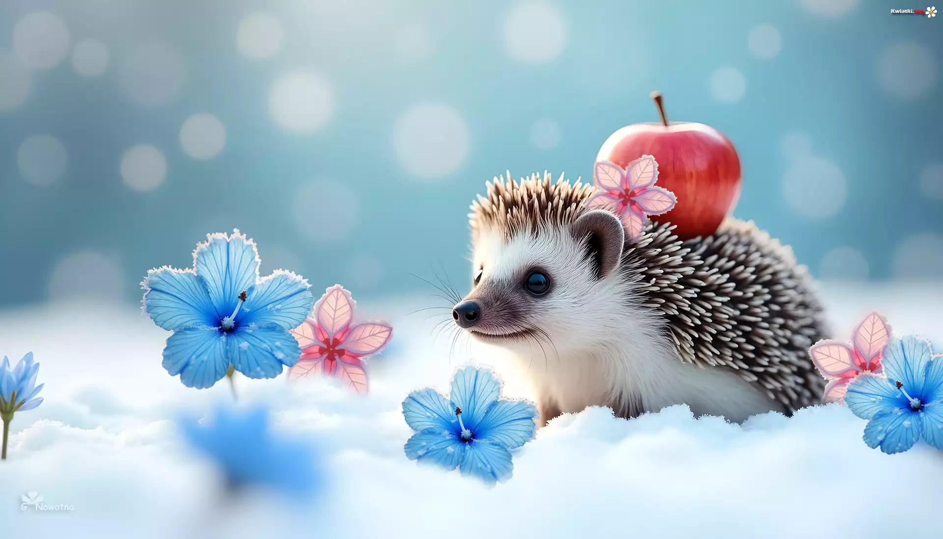 Jeż, Kwiaty, Jabłko, Śnieg, Grafika - Zdjęcia