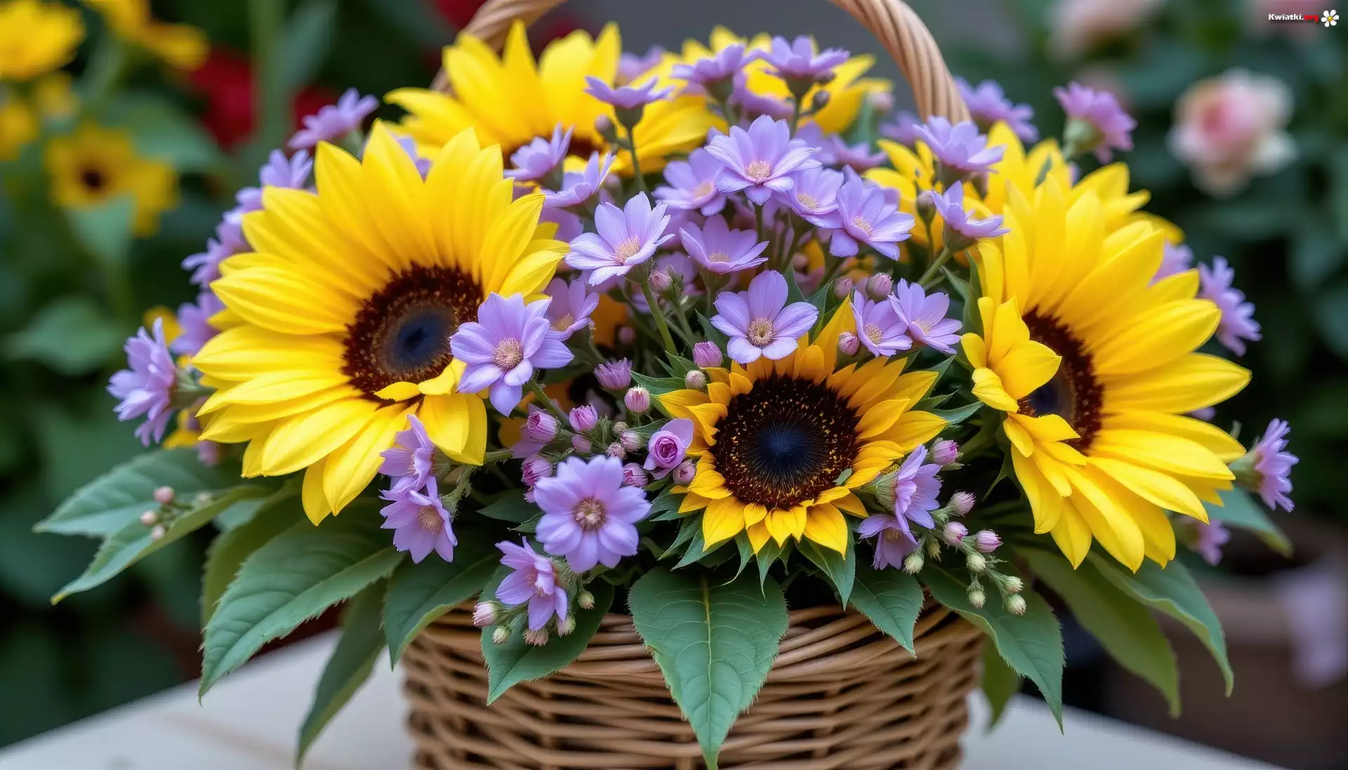 Bukiet, Słoneczniki, Jasnofioletowe, Kwiaty, Koszyk, Grafika AI - Zdjęcia