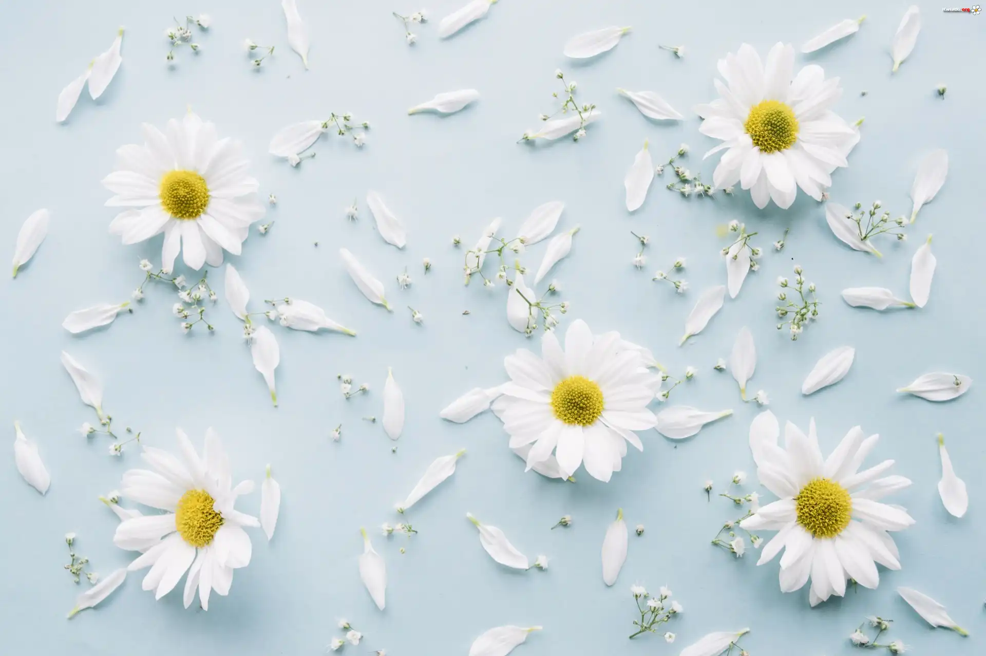 Kwiaty, Białe, Płatki, Jasnoniebieskie tło - Zdjęcia