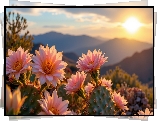 Różowe, Kwiaty, Kaktusy, Wschód słońca - Zdjęcia