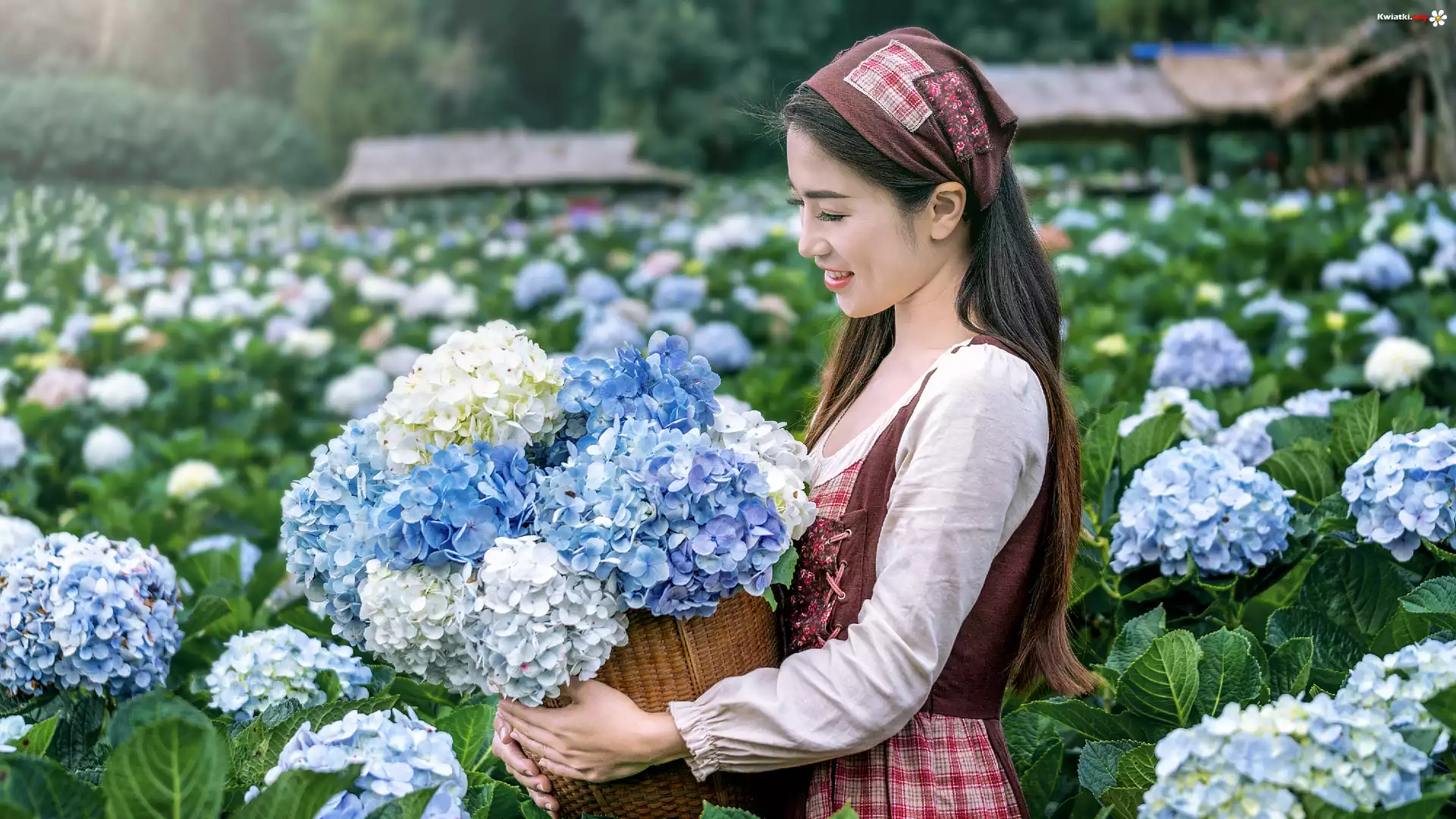 Kwiaty, Hortensje, Kobieta, Kosz - Zdjęcia