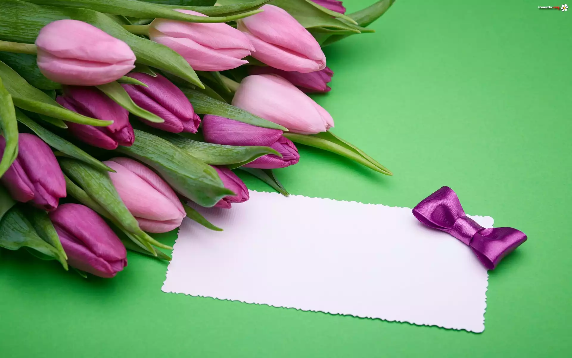 Kwiaty, Tulipany, Fioletowe, Kokardka, Kartka - Zdjęcia