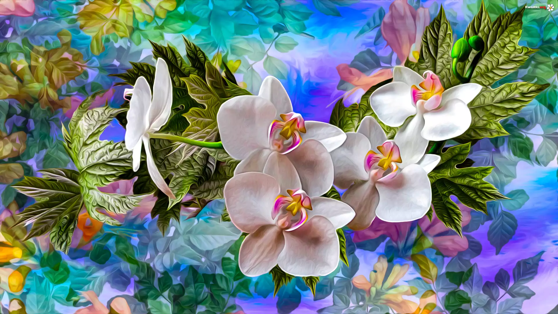 Kwiaty, Storczyki, Liście, Grafika, Kolorowe tło - Zdjęcia