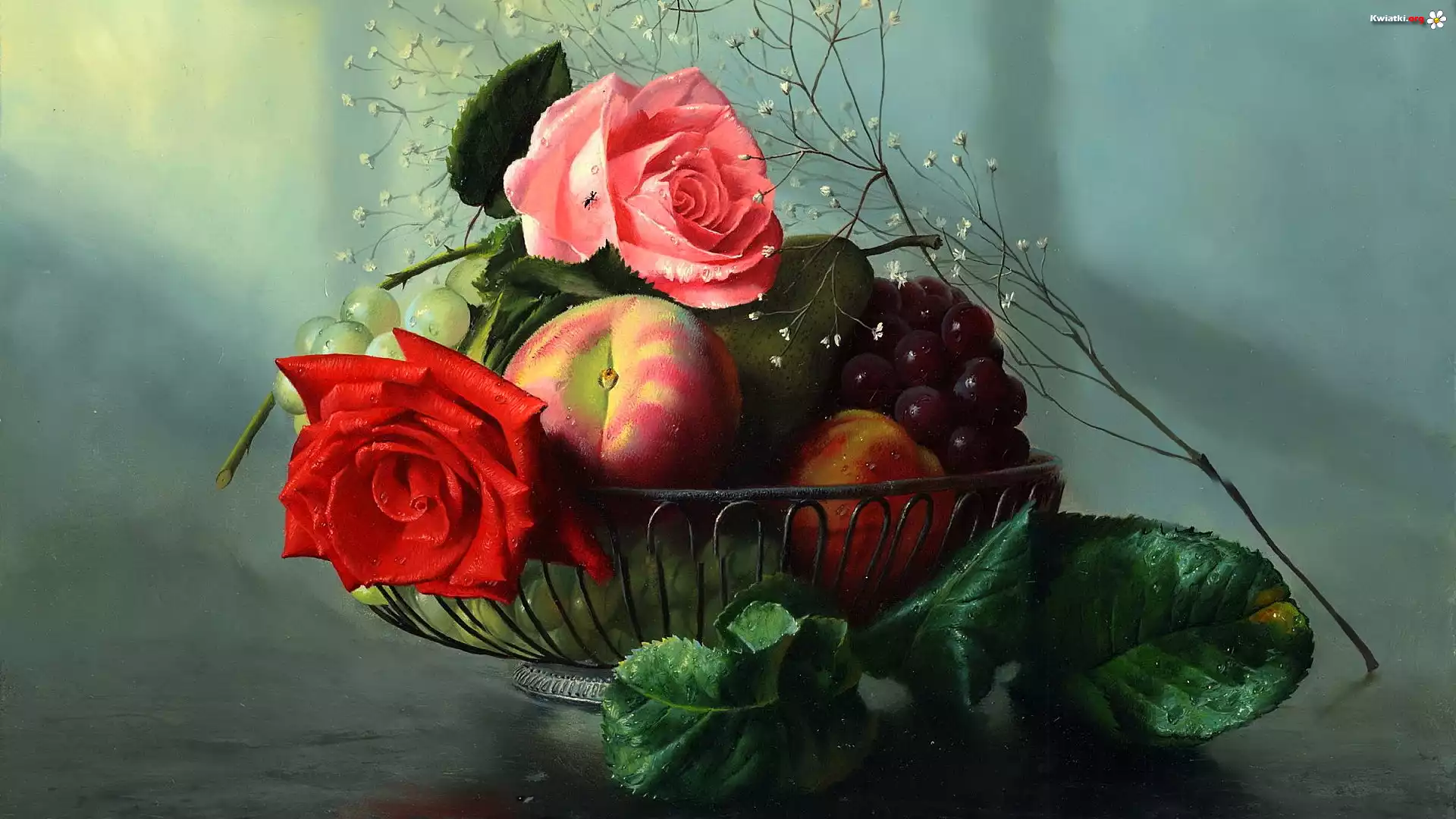 Kompozycja, Kwiaty, Róże, Owoce - Zdjęcia