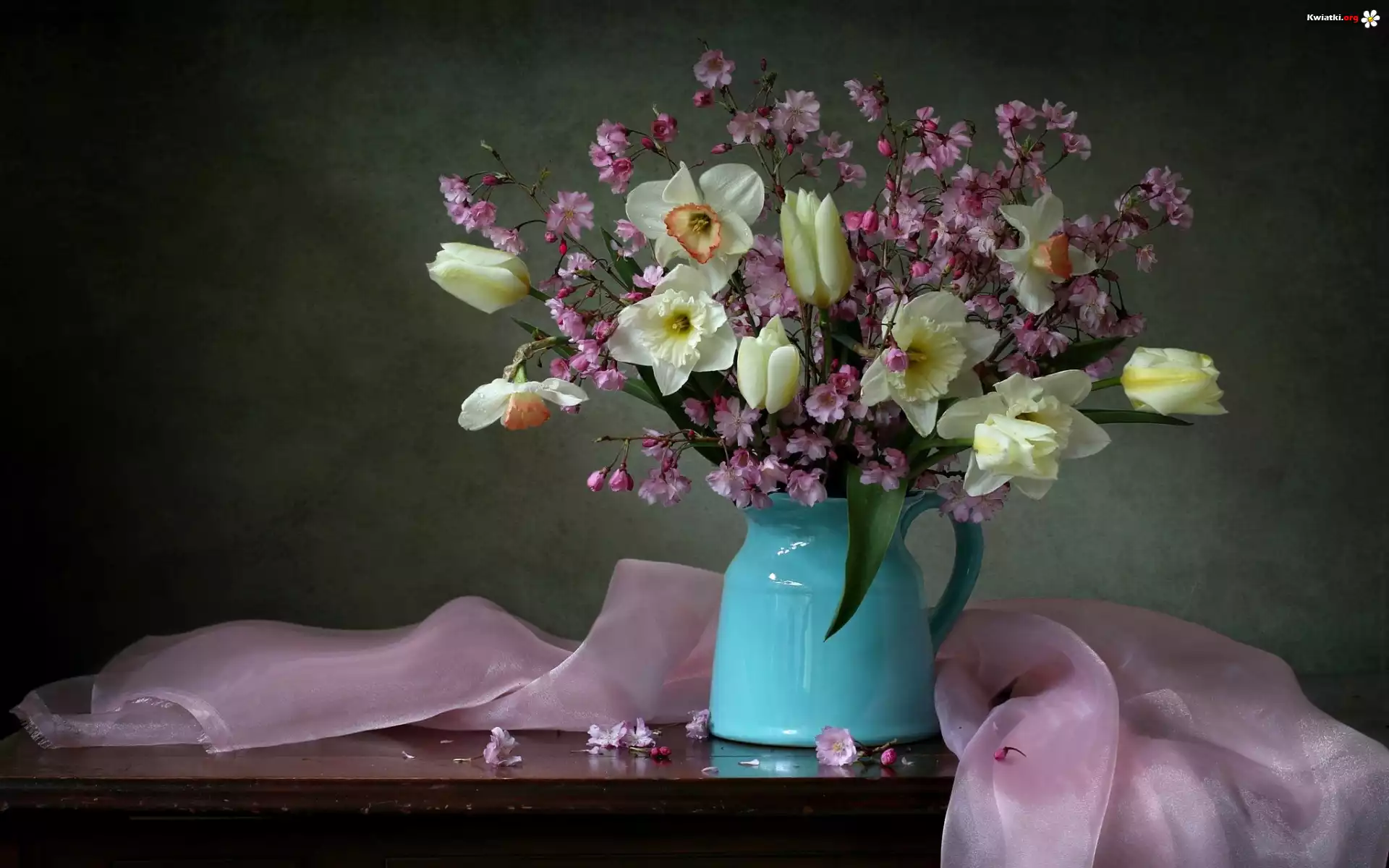 Kwiat Kwiaty, Tulipany, Żonkile, Gałązki, Dzbanek, Szal, Kompozycja, Bukiet kwiatów