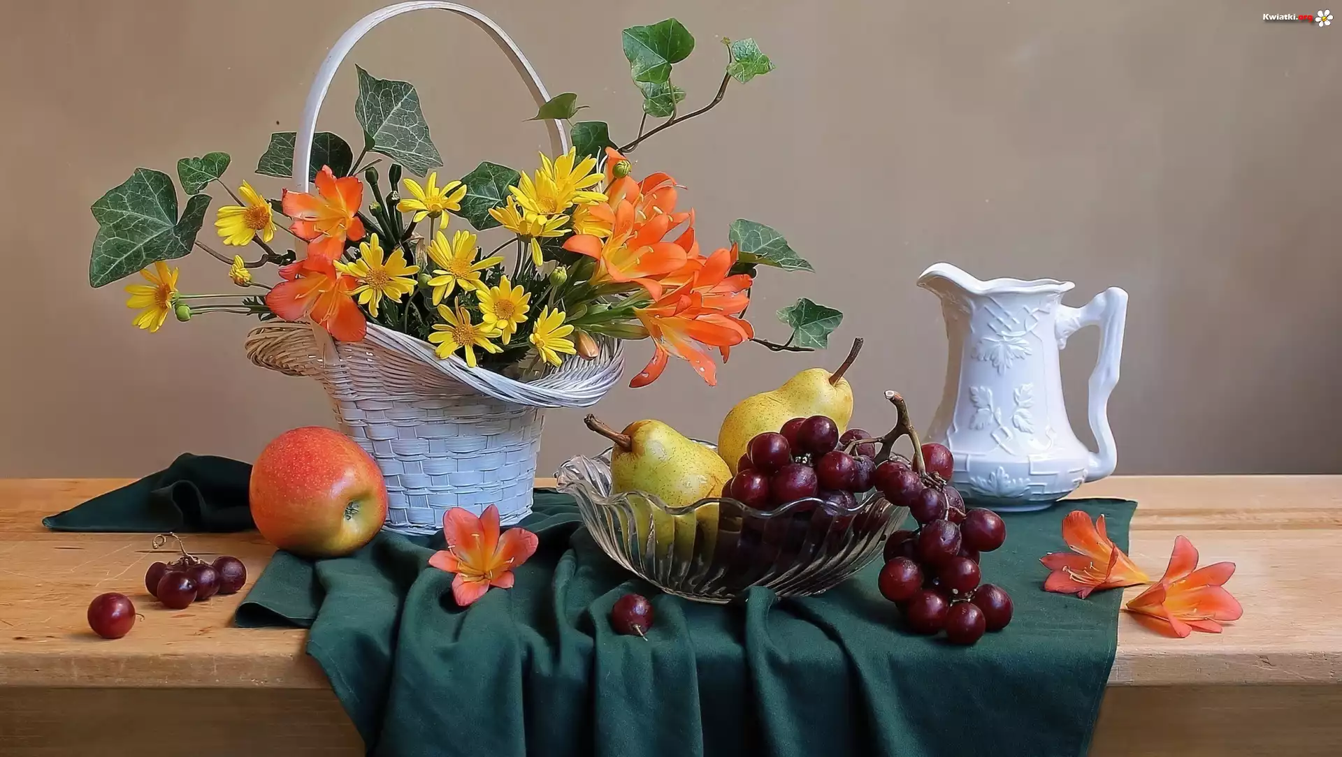 Kompozycja, Kwiaty, Alstremeria, Owoce, Jabłko, Gruszki, Winogrona - Zdjęcia