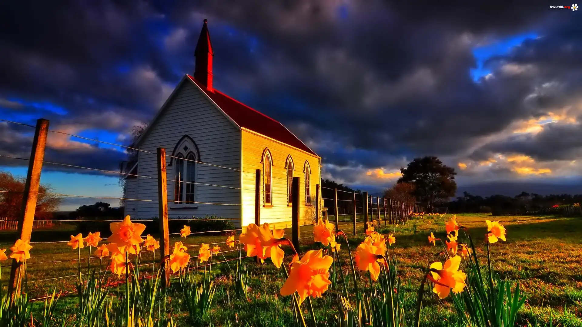 Kościółek, Kwiaty, Chmury - Zdjęcia