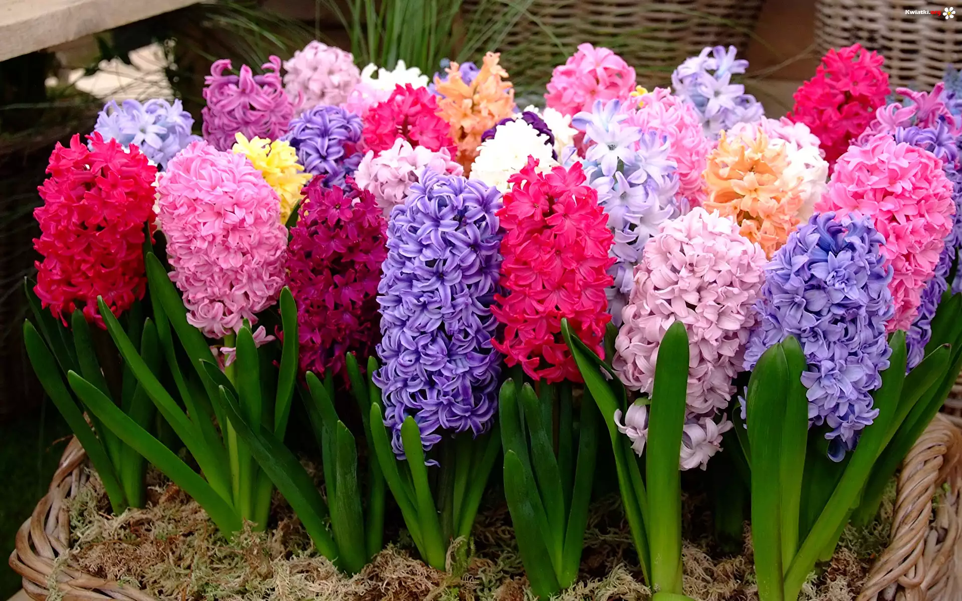 Kwiaty, Kolorowe, Hiacynty, Kosz, Deski - Zdjęcia