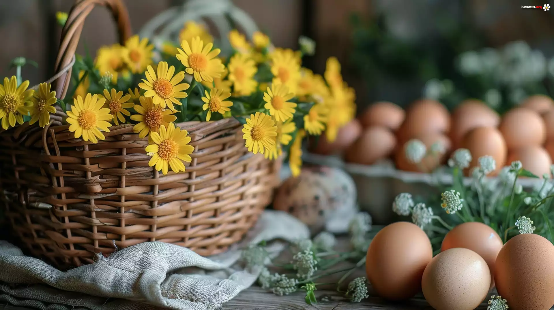 Żółte, Kwiaty, Koszyk, Tkanina, Jajka - Zdjęcia