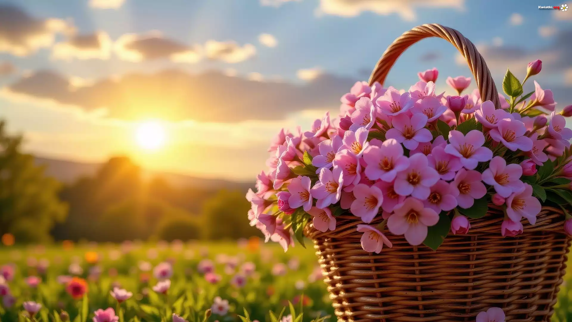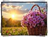 Różowe, Kwiaty, Koszyk, Łąka, Słońce - Zdjęcia