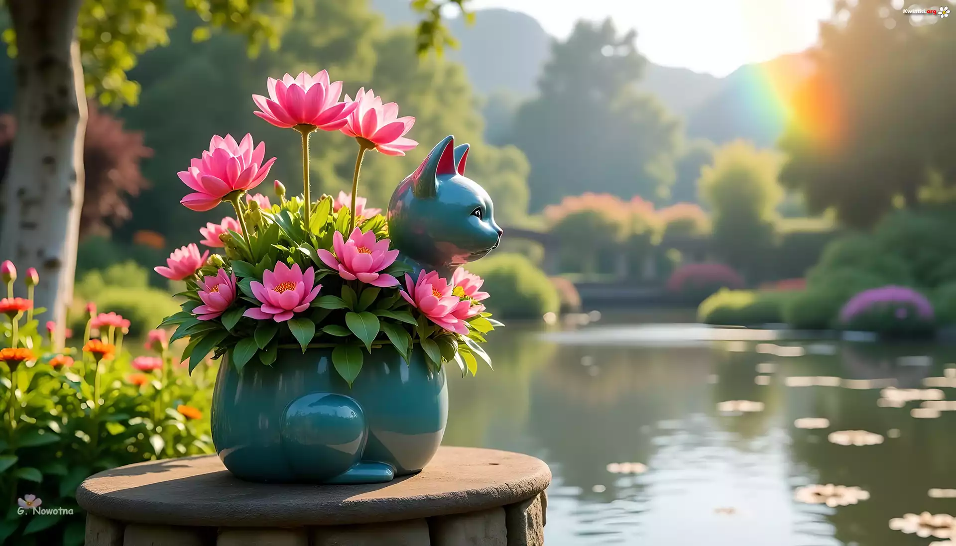 Doniczka, Kwiaty, Kot, Jezioro, Grafika - Zdjęcia