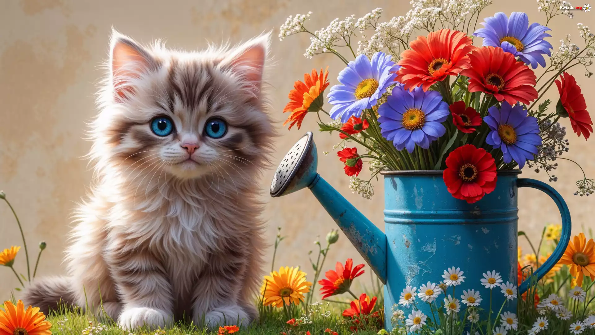 Kwiat Mały, Puszysty, Kot, Niebieskie, Oczy, Konewka, Kolorowe, Kwiaty