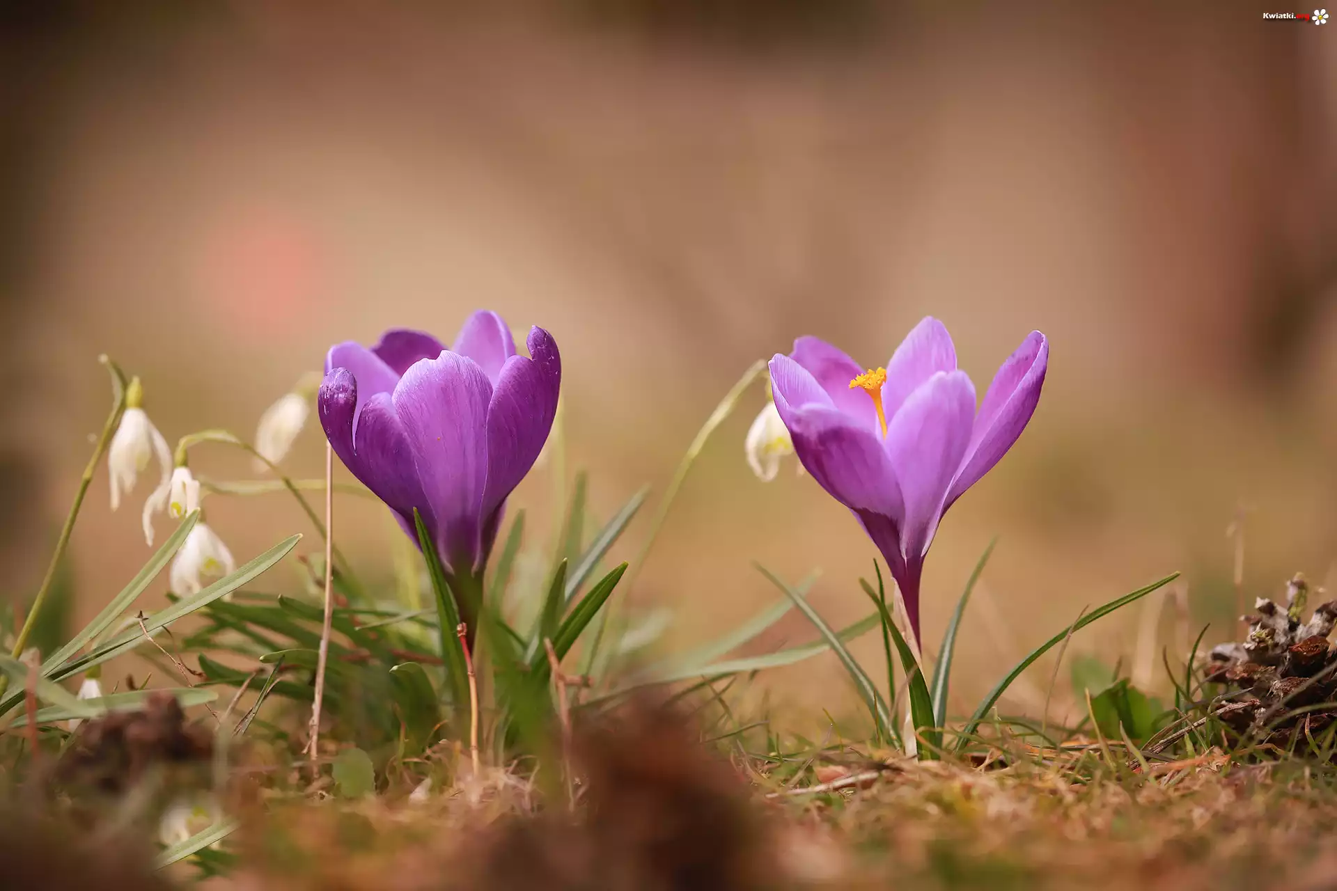 Kwiat Krokusy, Dwa, Fioletowe, Kwiaty