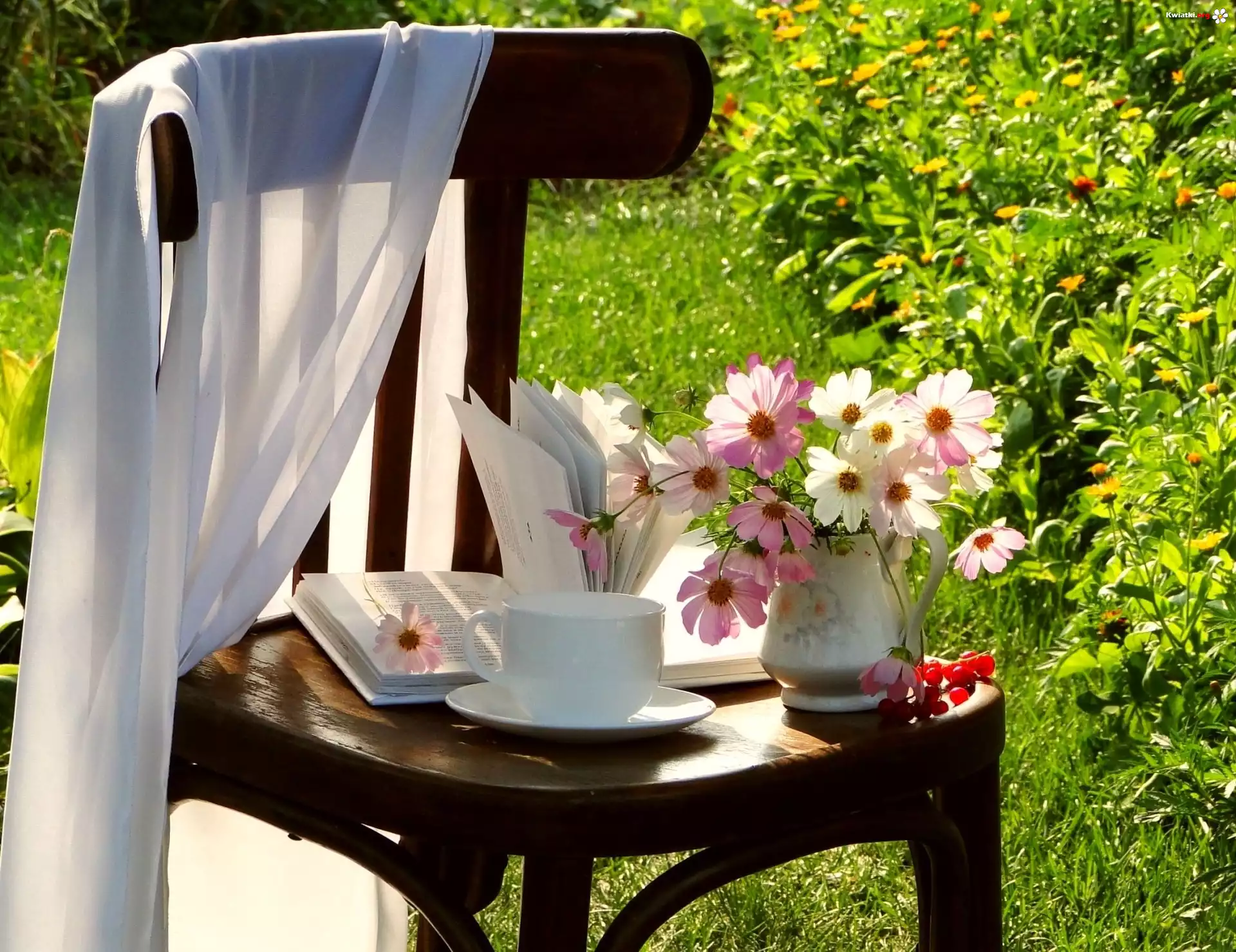 Kwiaty, Kosmea, Książka, Krzesło, Ogród - Zdjęcia
