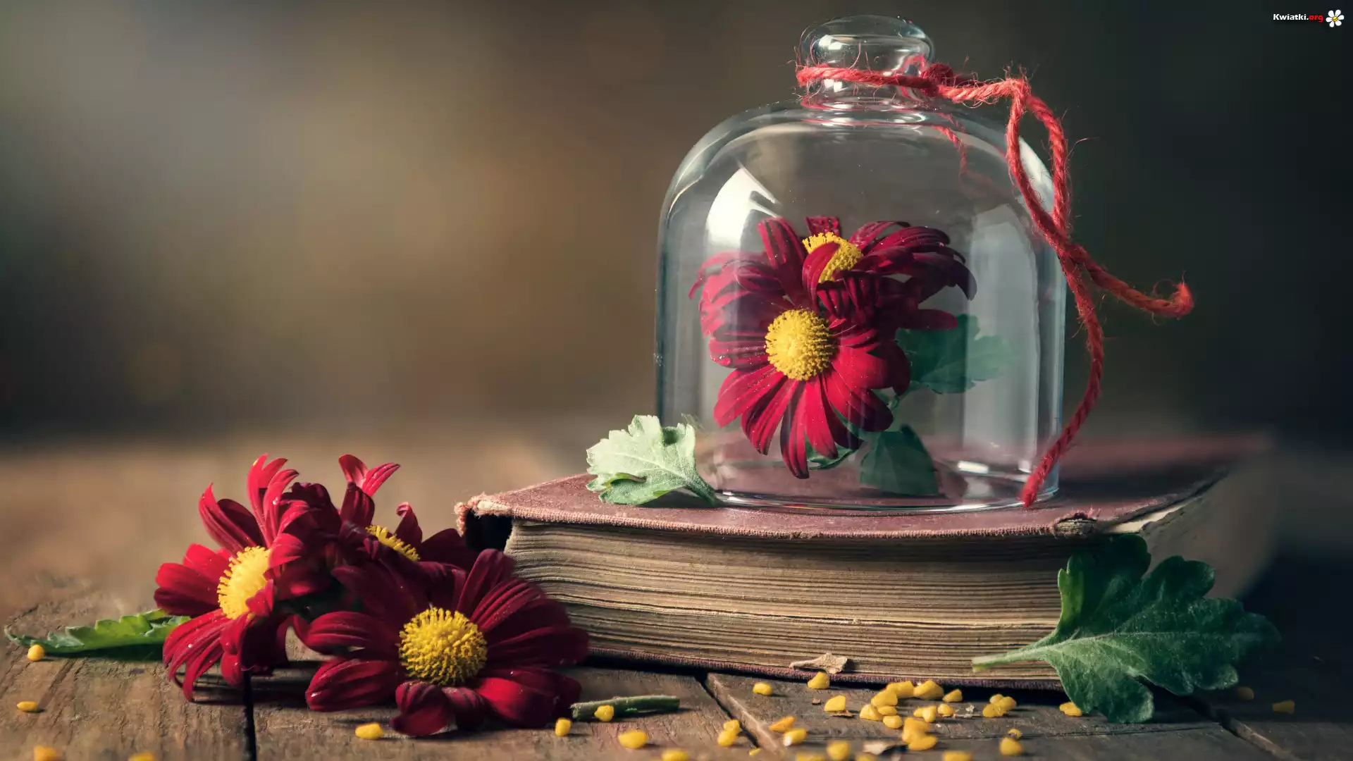Książka, Kwiaty, Chryzantemy, Szklane, Naczynie, Sznurek, Liście - Zdjęcia