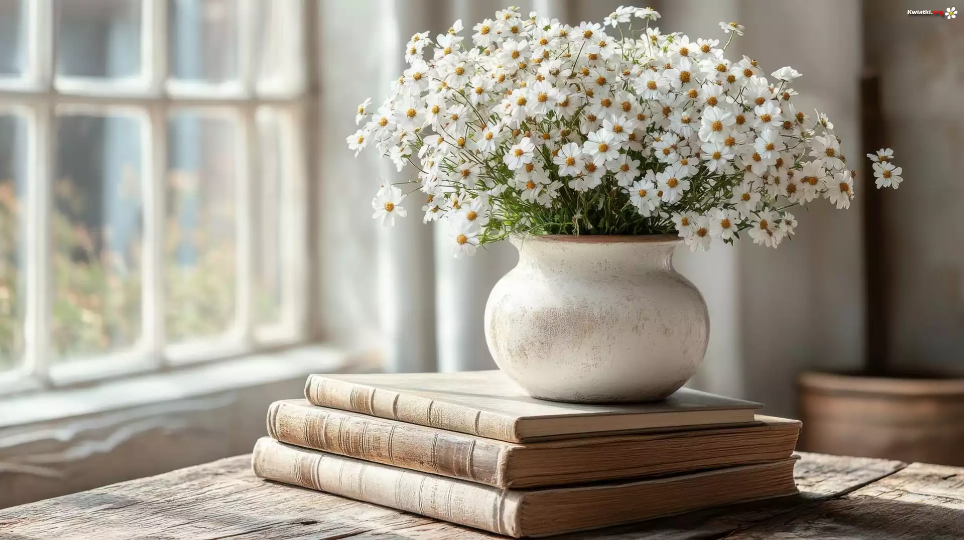 Kwiat Białe, Kwiaty, Książki, Wazon, Okno