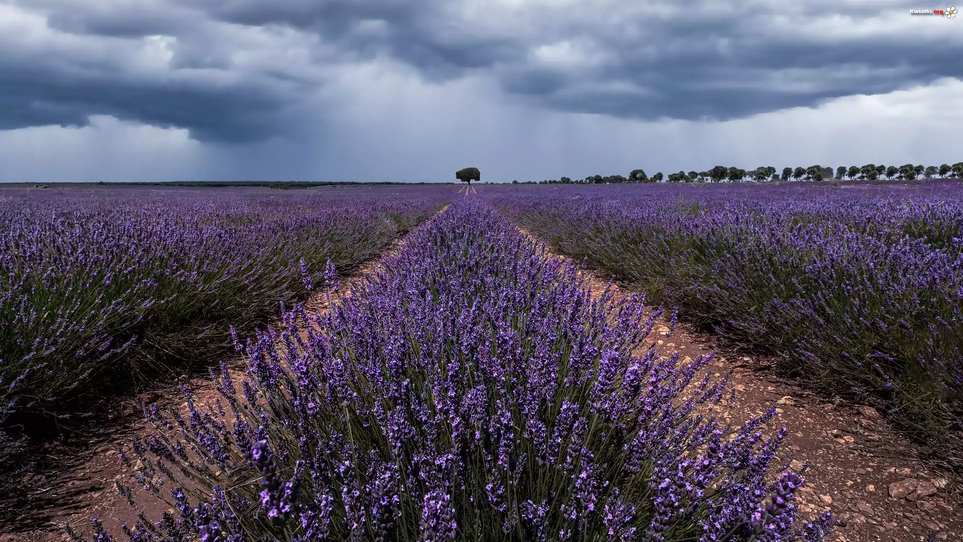 Kwiat Pole, Kwiaty, Lawenda, Drzewo, Chmury