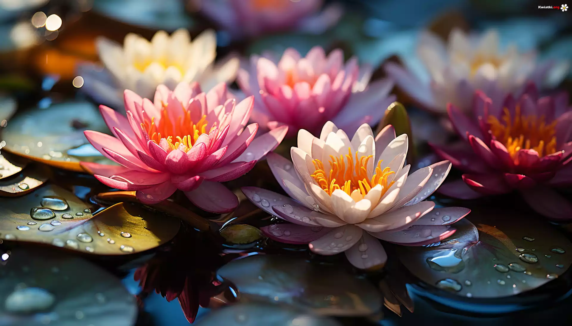 Kolorowe, Kwiaty, Lilie wodne, Liście - Zdjęcia