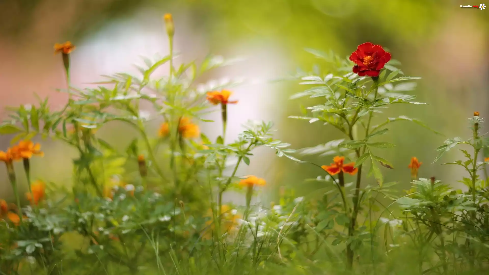 Kwiaty, Aksamitki, Liście, Rozmycie - Zdjęcia