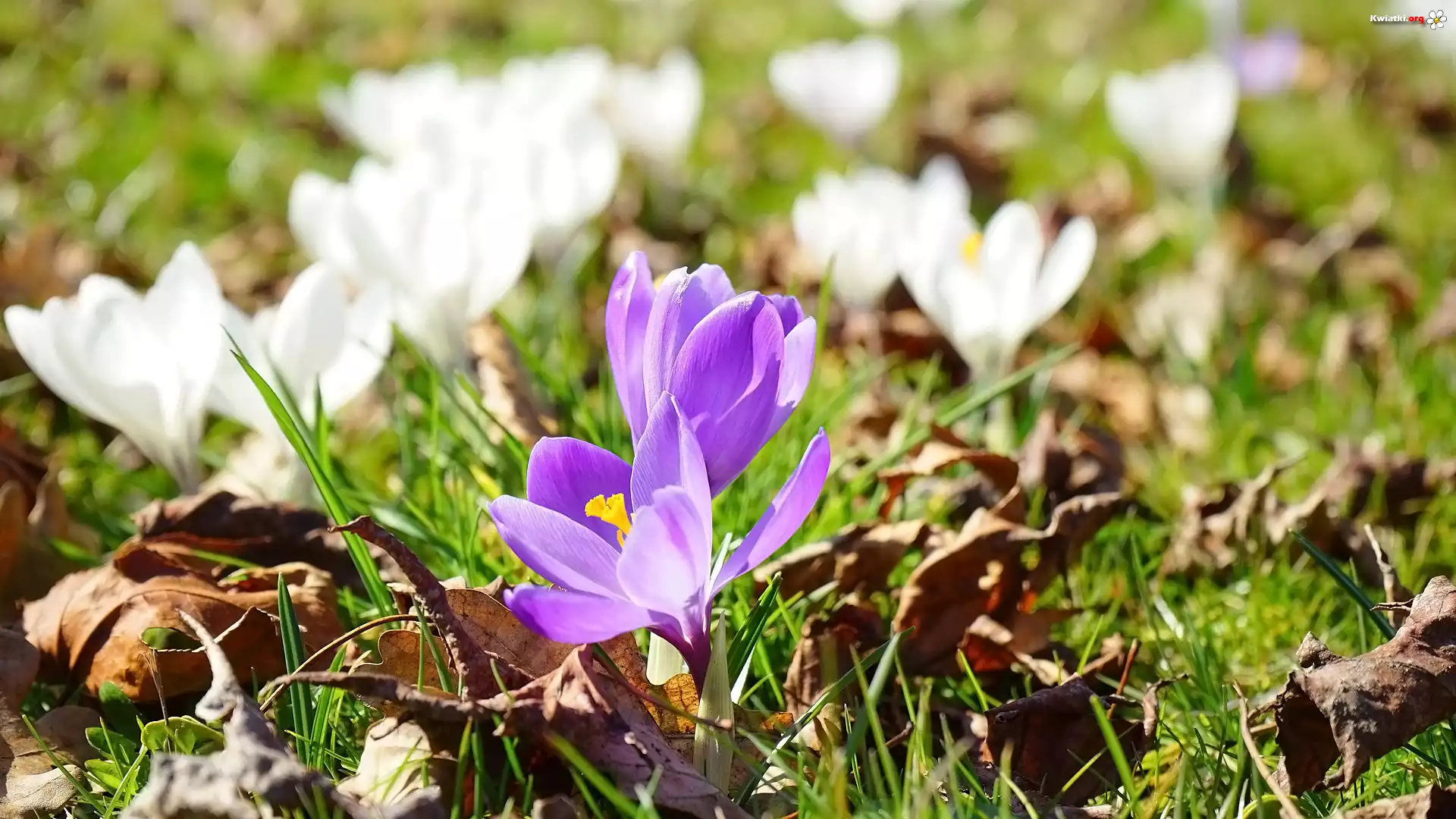 Kwiaty, Białe, Fioletowe, Krokusy, Liście, Trawa - Zdjęcia