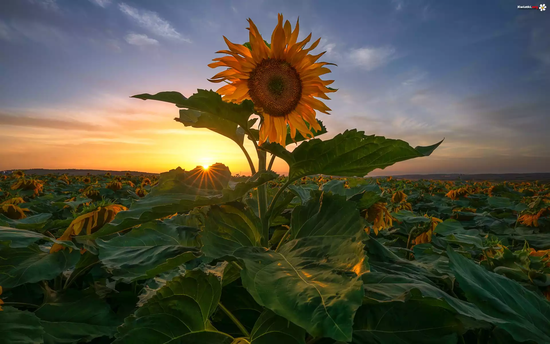 Kwiat Słoneczniki, Kwiaty, Liście, Zachód słońca