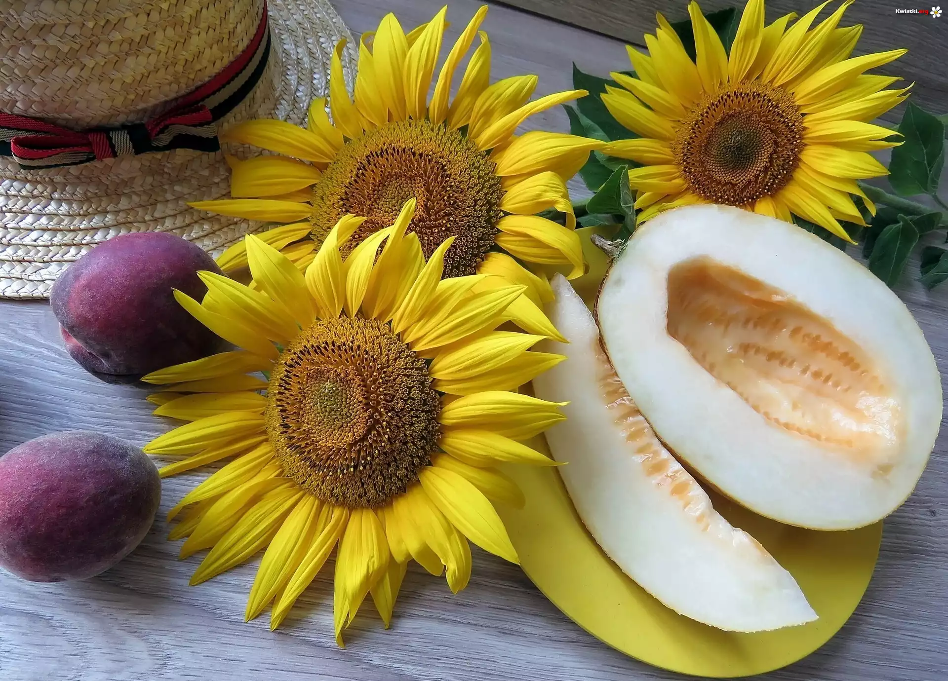 Kwiat Kwiaty, Słoneczniki, Melon, Śliwki, Kapelusz