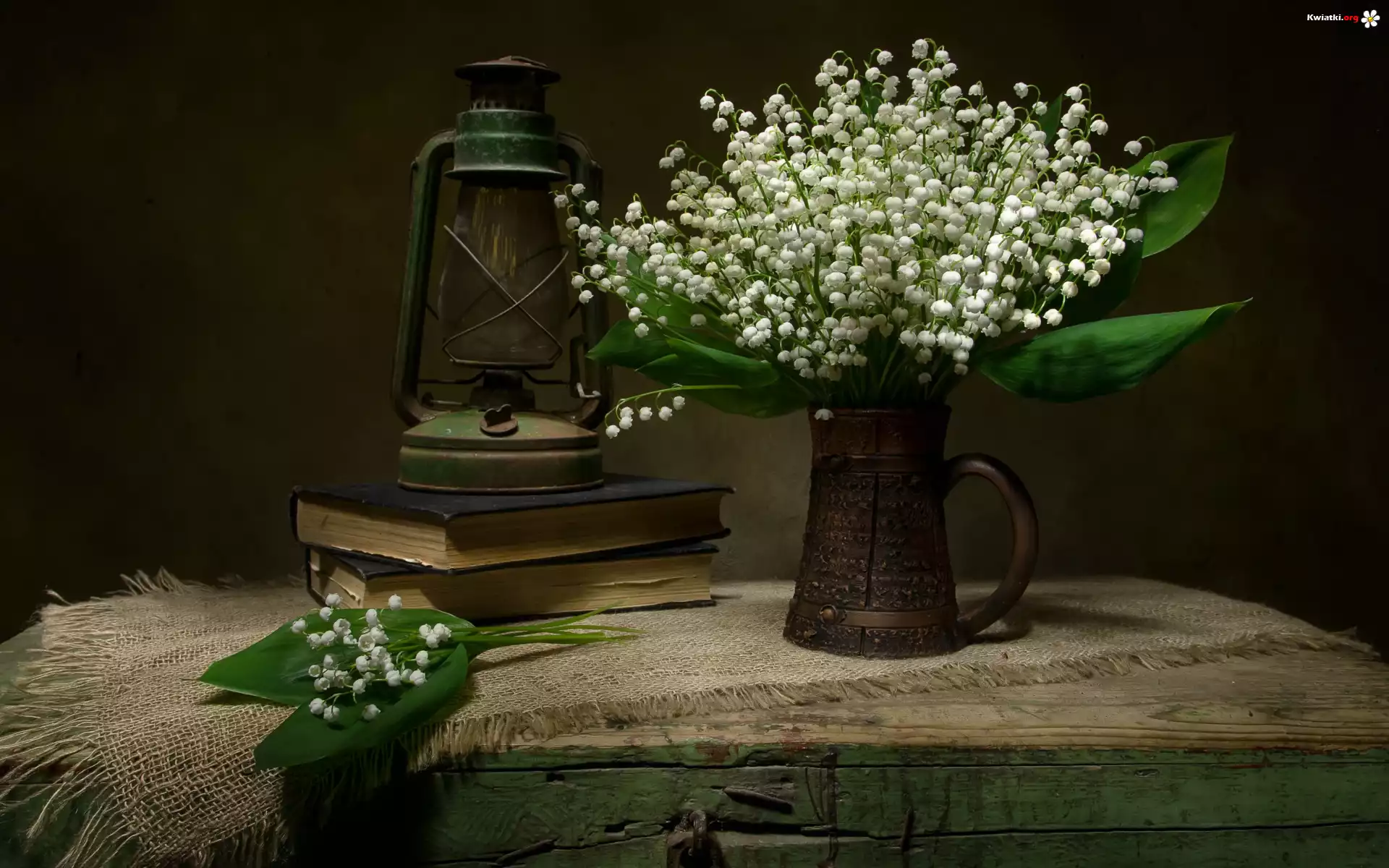 Kwiaty, Konwalie, Bukiet, Dzbanek, Książki, Lampa naftowa, Skrzynia, Kompozycja - Zdjęcia