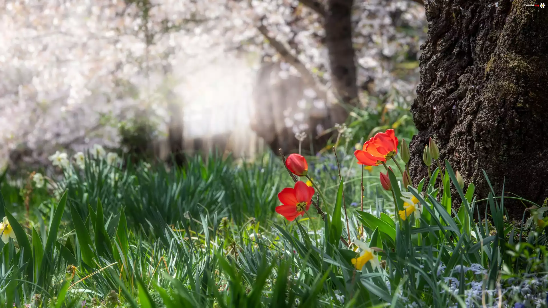 Kwiaty, Tulipany, Narcyzy, Drzewa - Zdjęcia