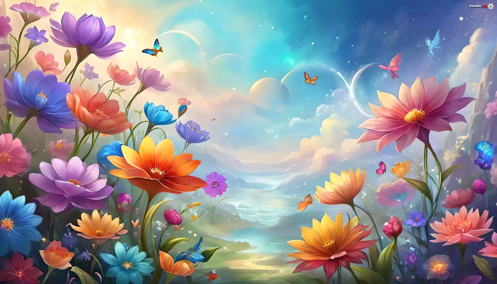 Kolorowe, Kwiaty, Niebo, Chmury, Grafika - Zdjęcia