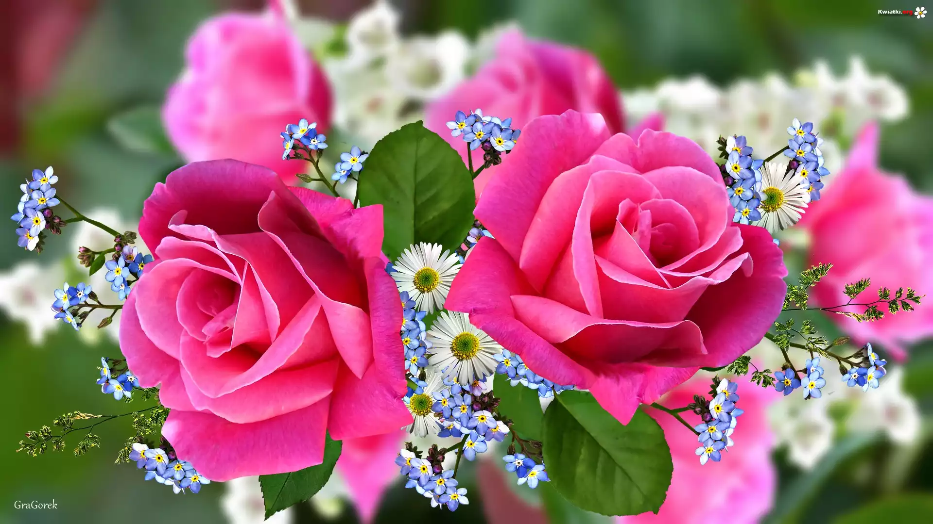 Kwiat Kwiaty, Różowe, Róże, Niezapominajki, Grafika