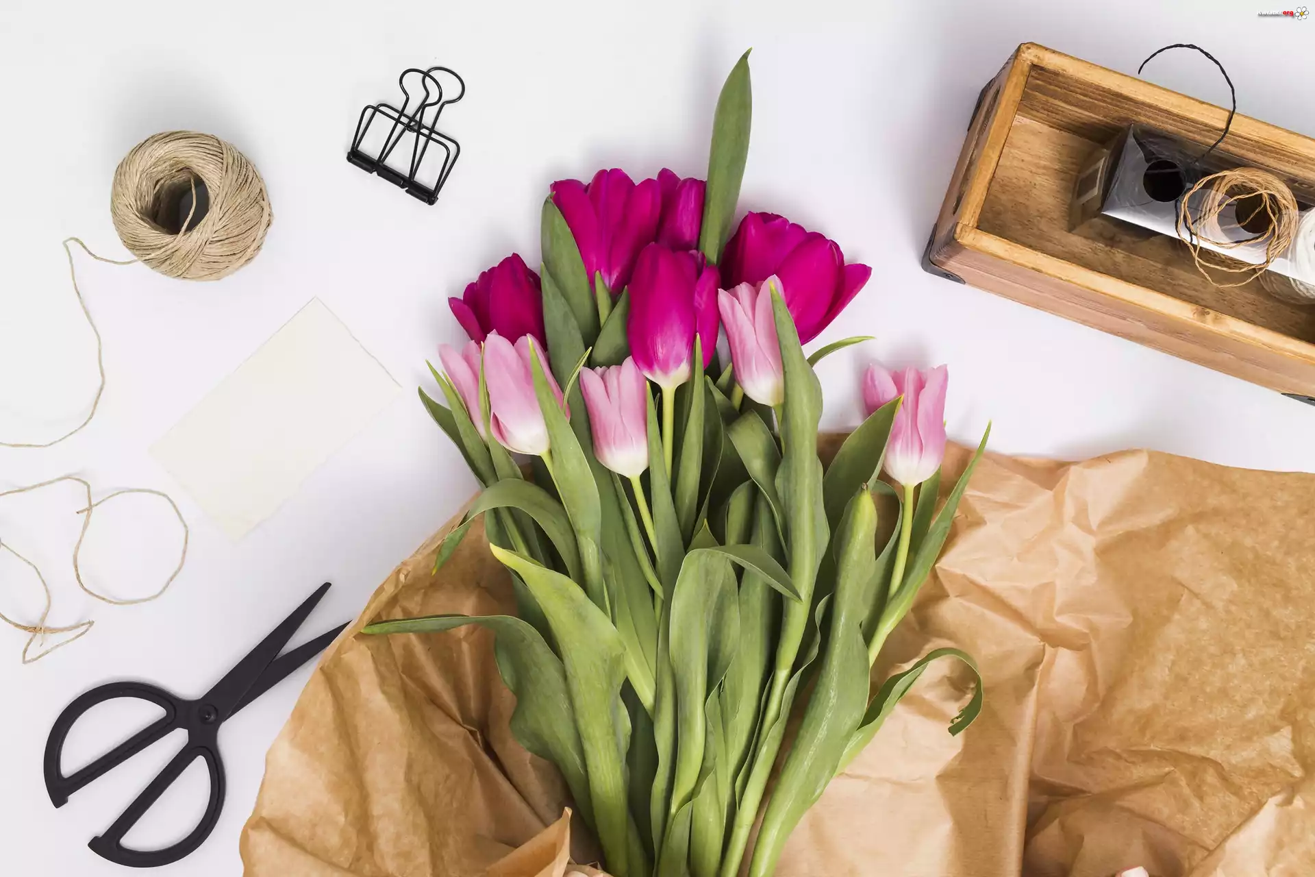 Kwiaty, Bukiet, Tulipany, Nożyczki, Sznurek - Zdjęcia