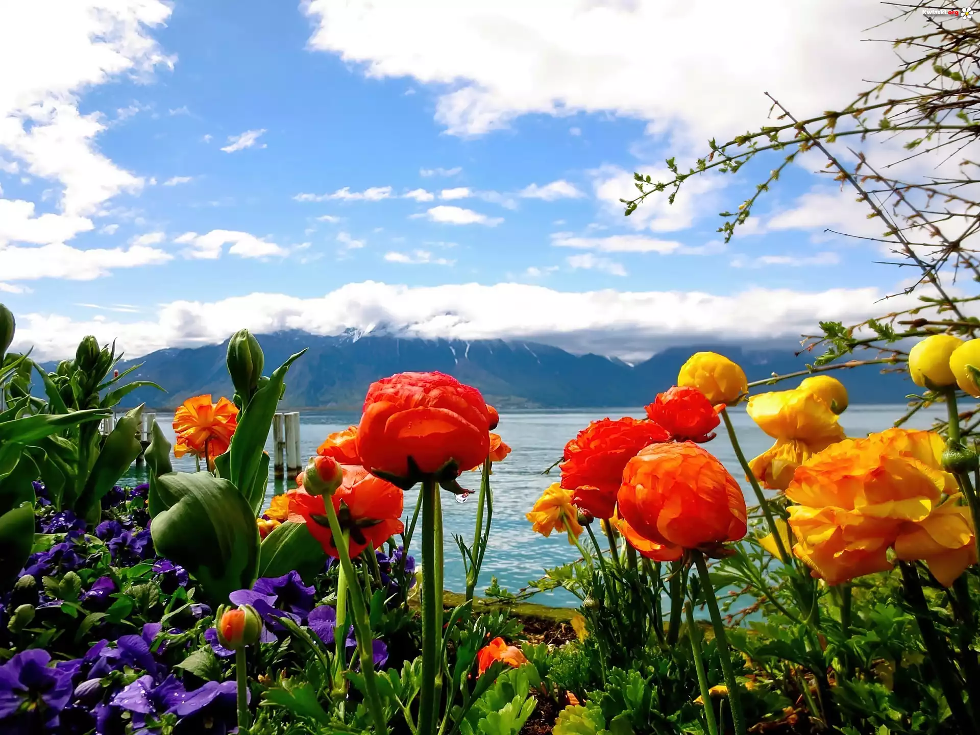 Kwiaty, Rzeka, Obłoki, Rozmycie - Zdjęcia