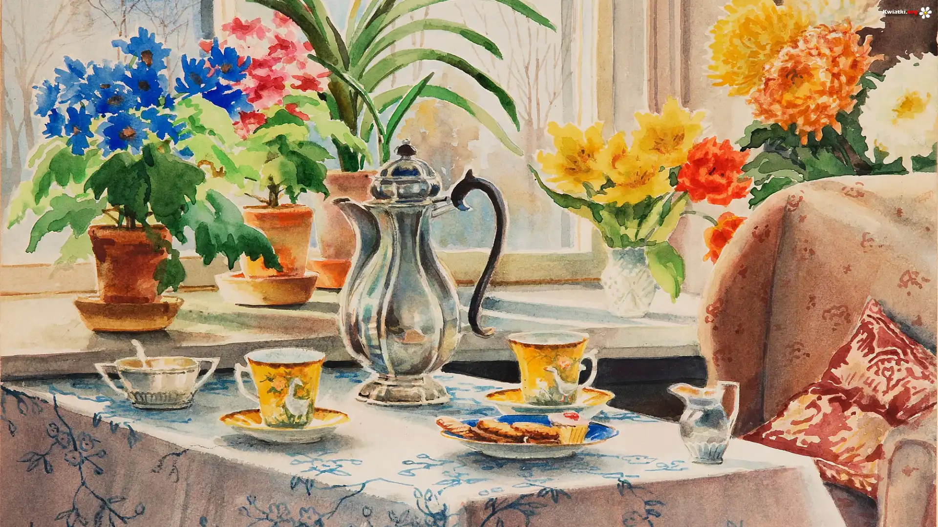 Kwiat Obraz, Akwarela, Olga Aleksandrowna Romanowa, Stół, Filiżanki, Dzbanek, Kwiaty