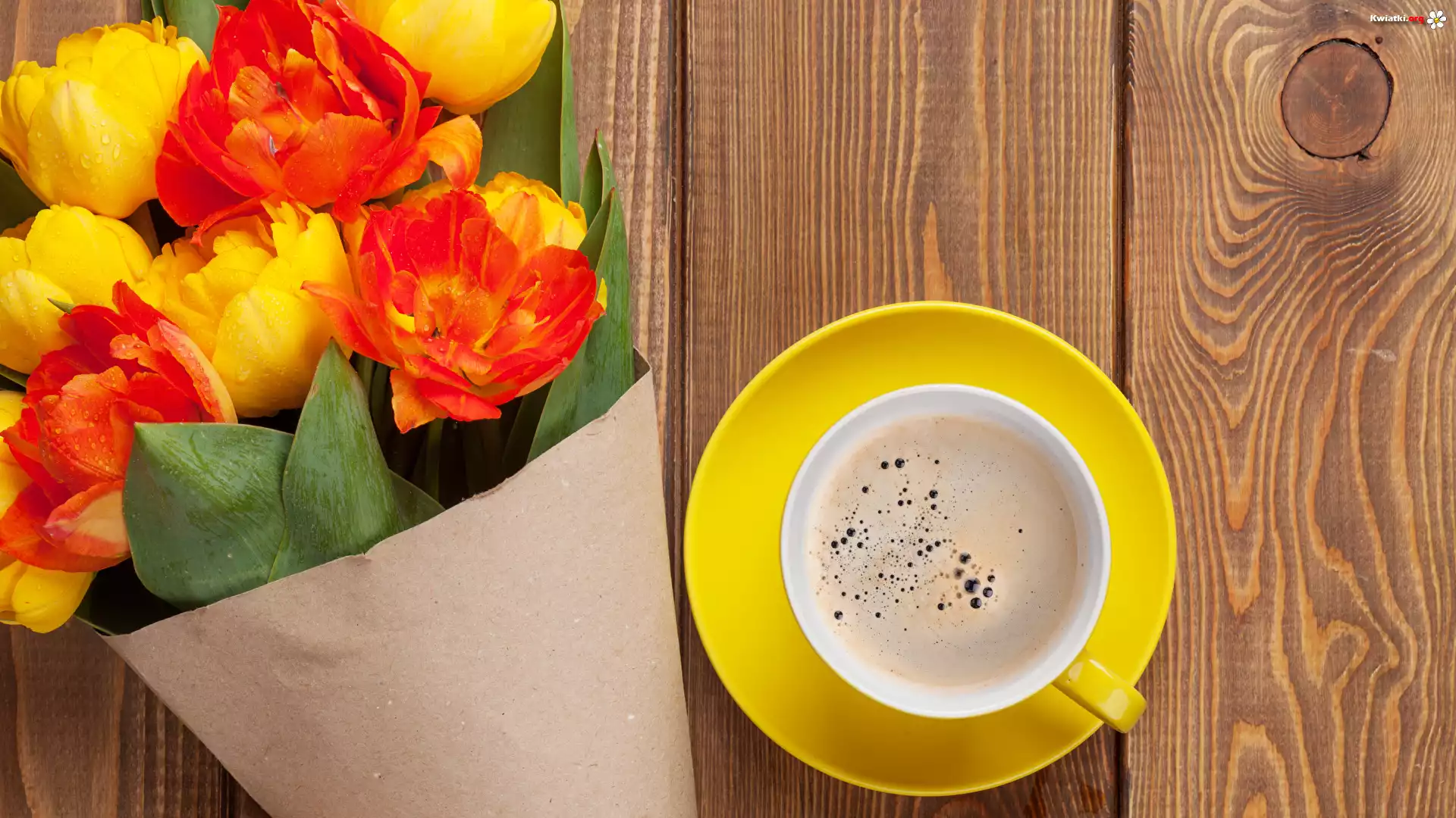 Kwiaty, Bukiet, Tulipany, Kawa, Żółta, Filiżanka - Zdjęcia
