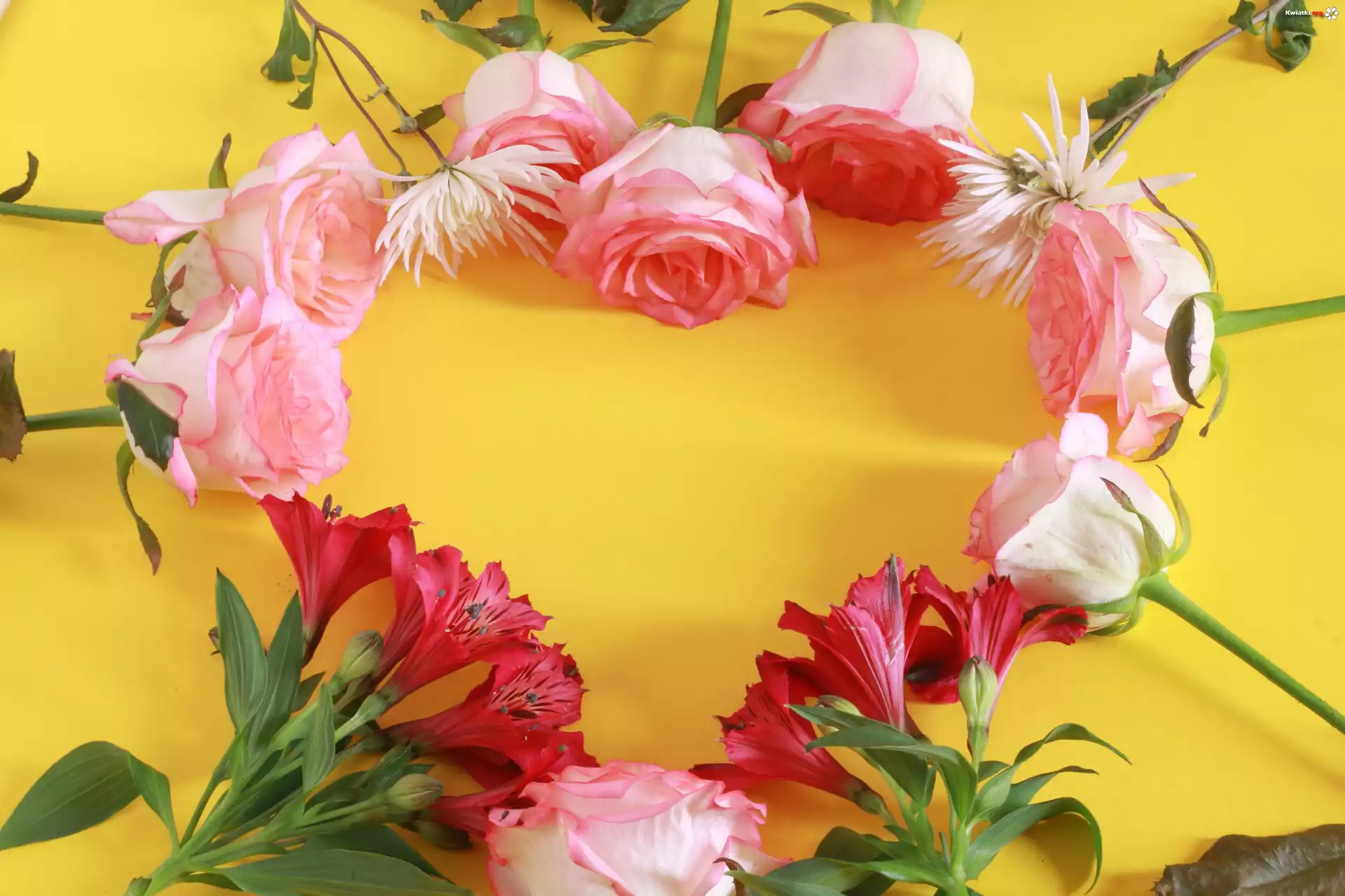 Kwiaty, Róże, Alstremeria, Serce, Żółte tło - Zdjęcia