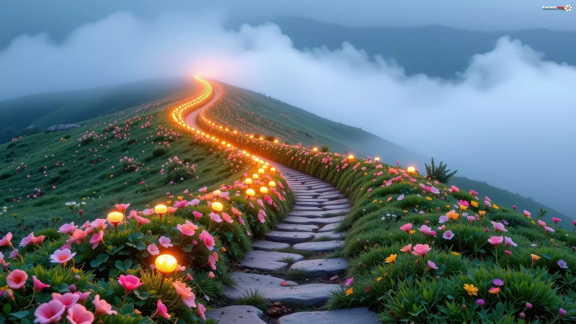 Kwiat Góra, Kamienista, Droga, Ścieżka, Lampy, Kolorowe, Kwiaty, Opadająca, Mgła, Grafika AI
