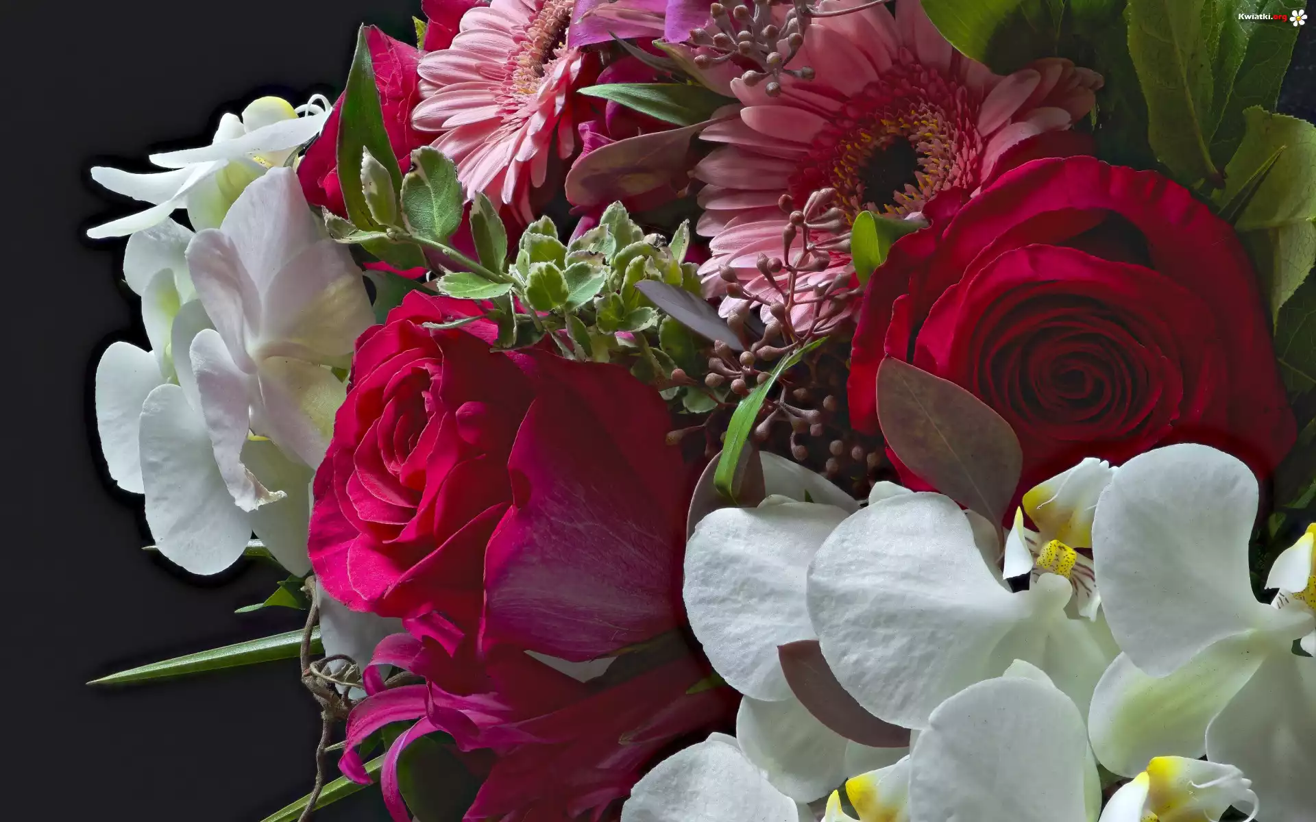 Kwiaty, Bukiet, Róże, Orchidea, Gerbera - Zdjęcia