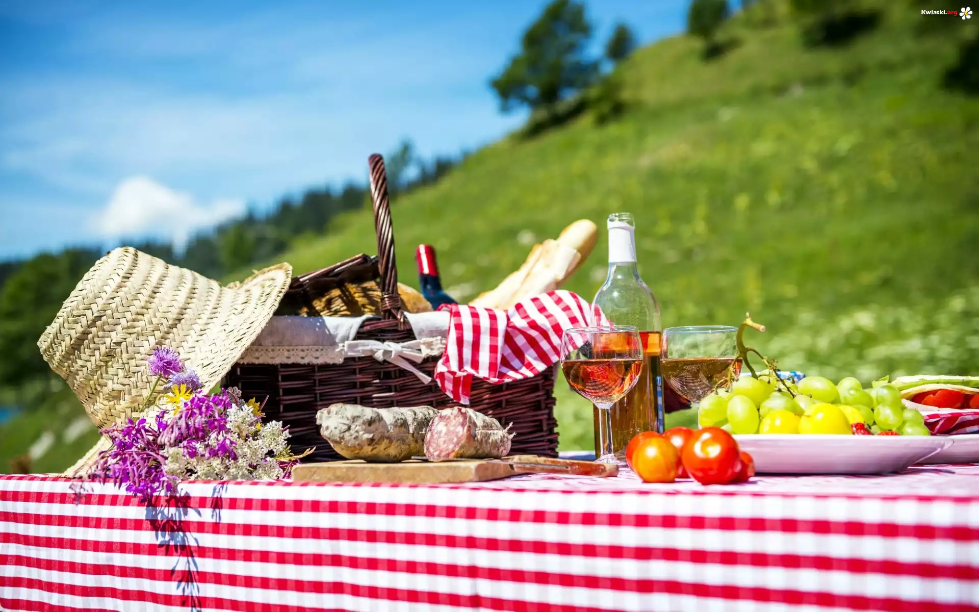 Owoce, Kwiaty, Wino, Koszyk, Kapelusz, Piknik, Łąka - Zdjęcia