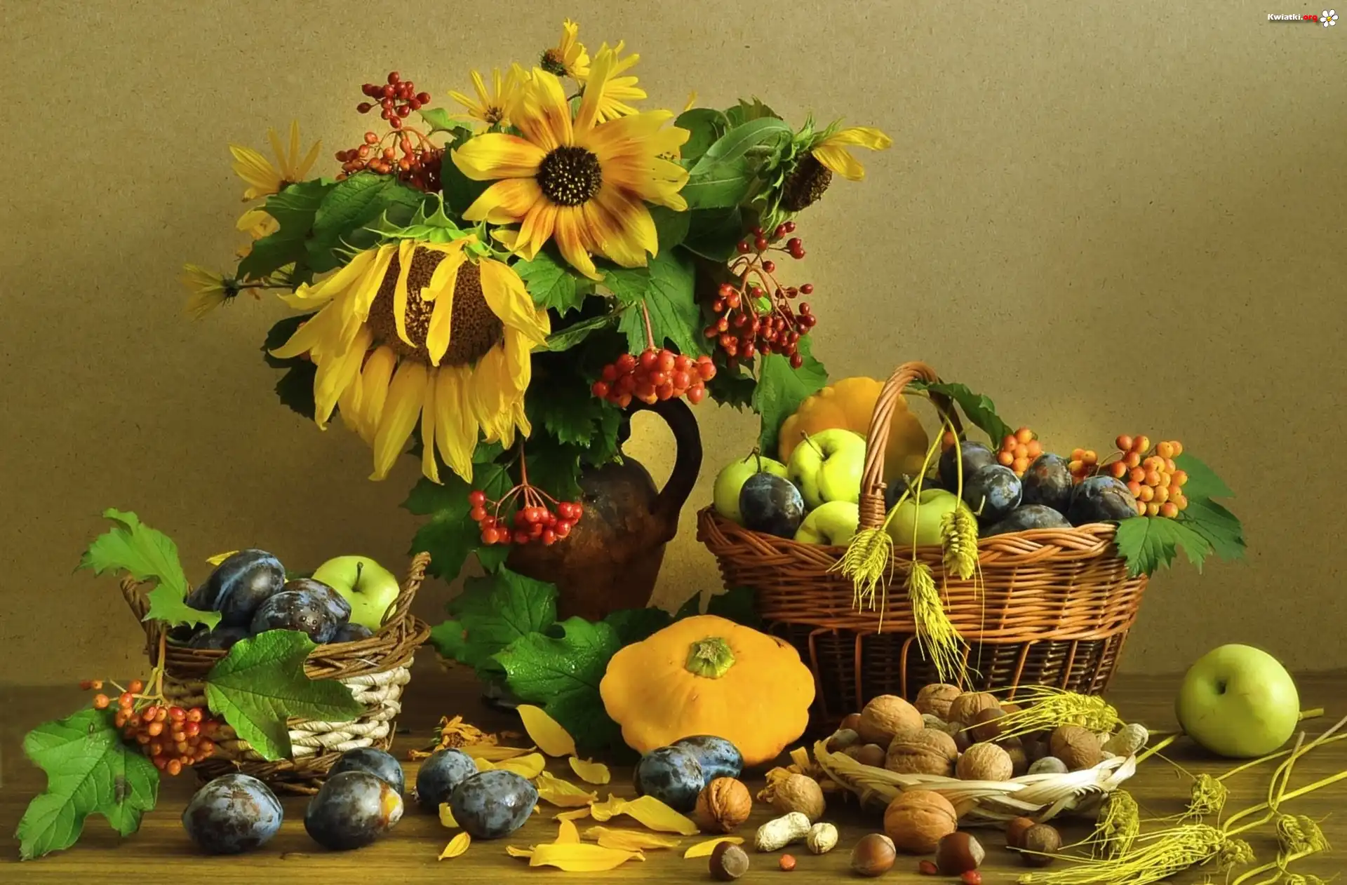 Kwiaty, Bukiet, Sloneczniki, Owoce, Warzywa - Zdjęcia