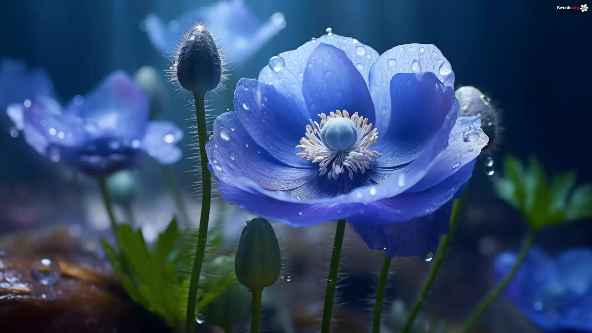Niebieskie, Kwiaty, Pąki, Krople, Grafika - Zdjęcia