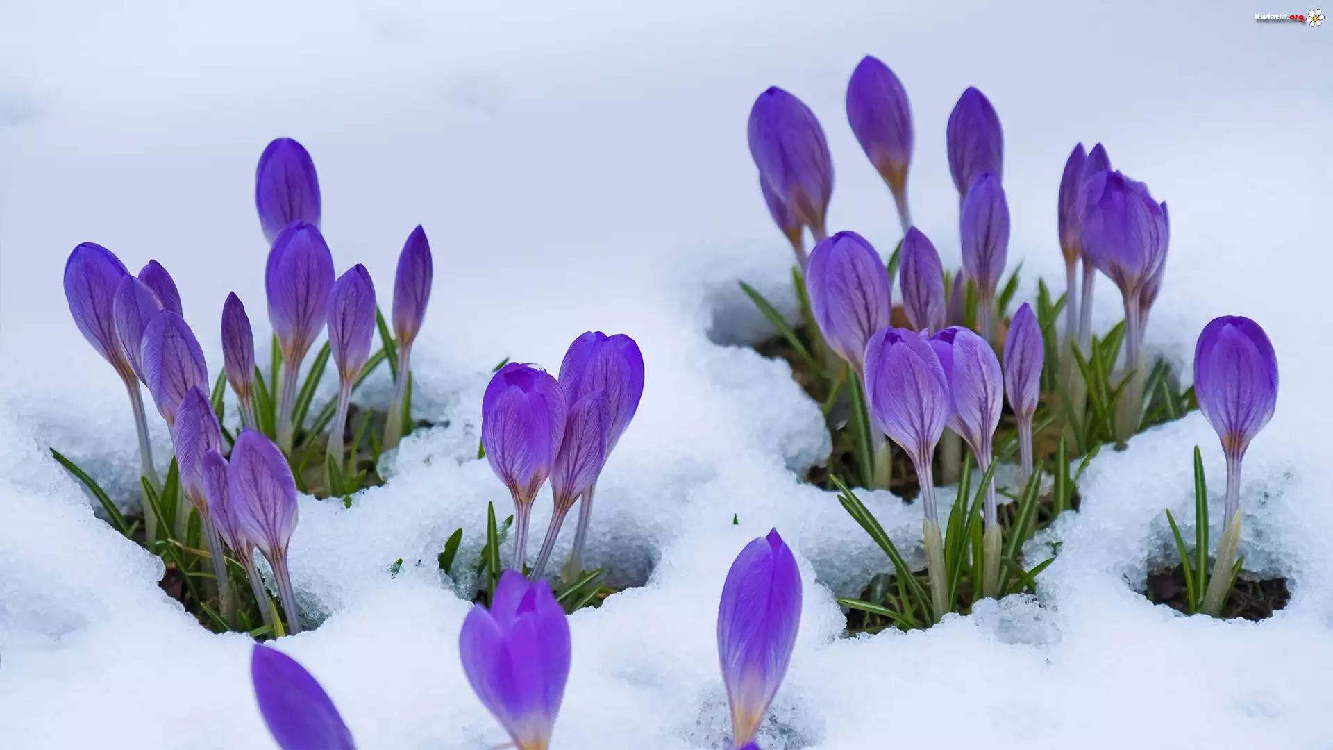 Kwiaty, Fioletowe, Krokusy, Pąki, Śnieg - Zdjęcia