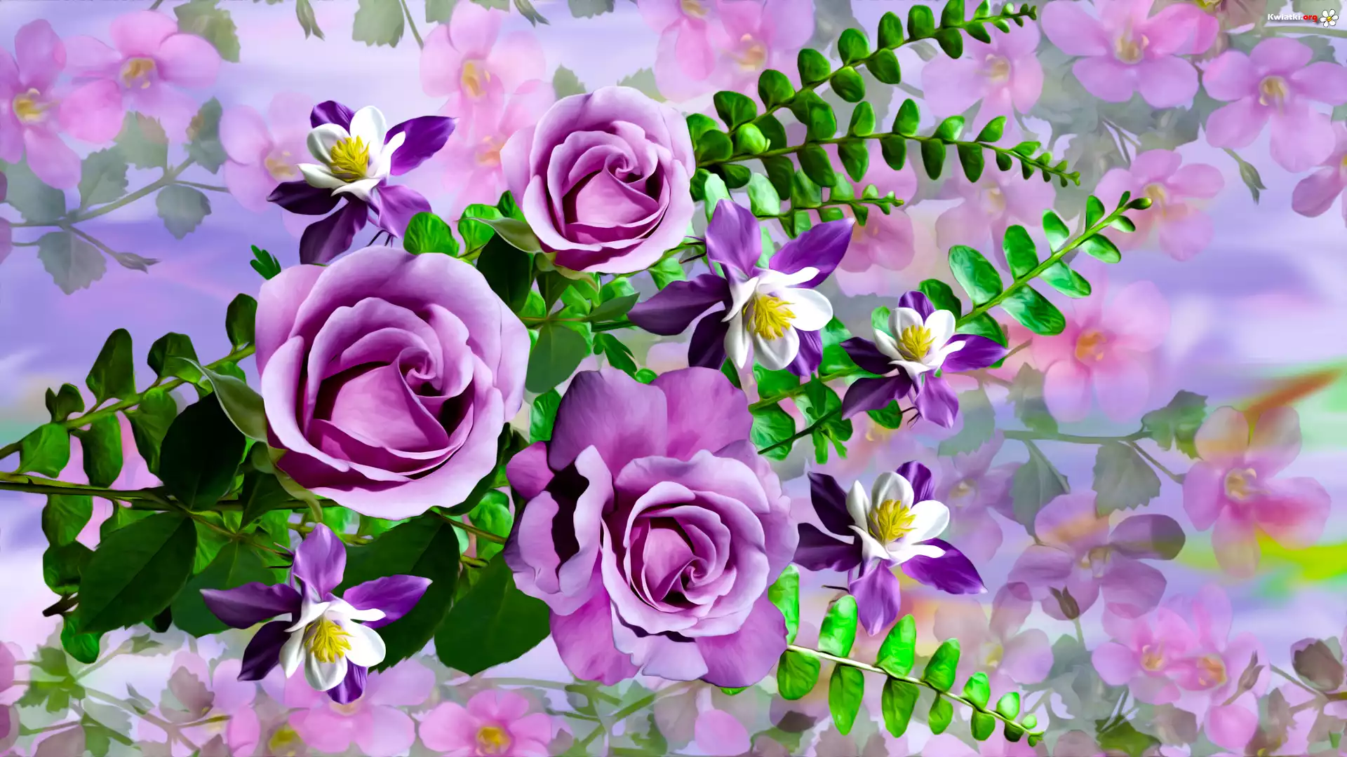 Kwiaty, Róże, Orlik, Paprotka, Grafika - Zdjęcia