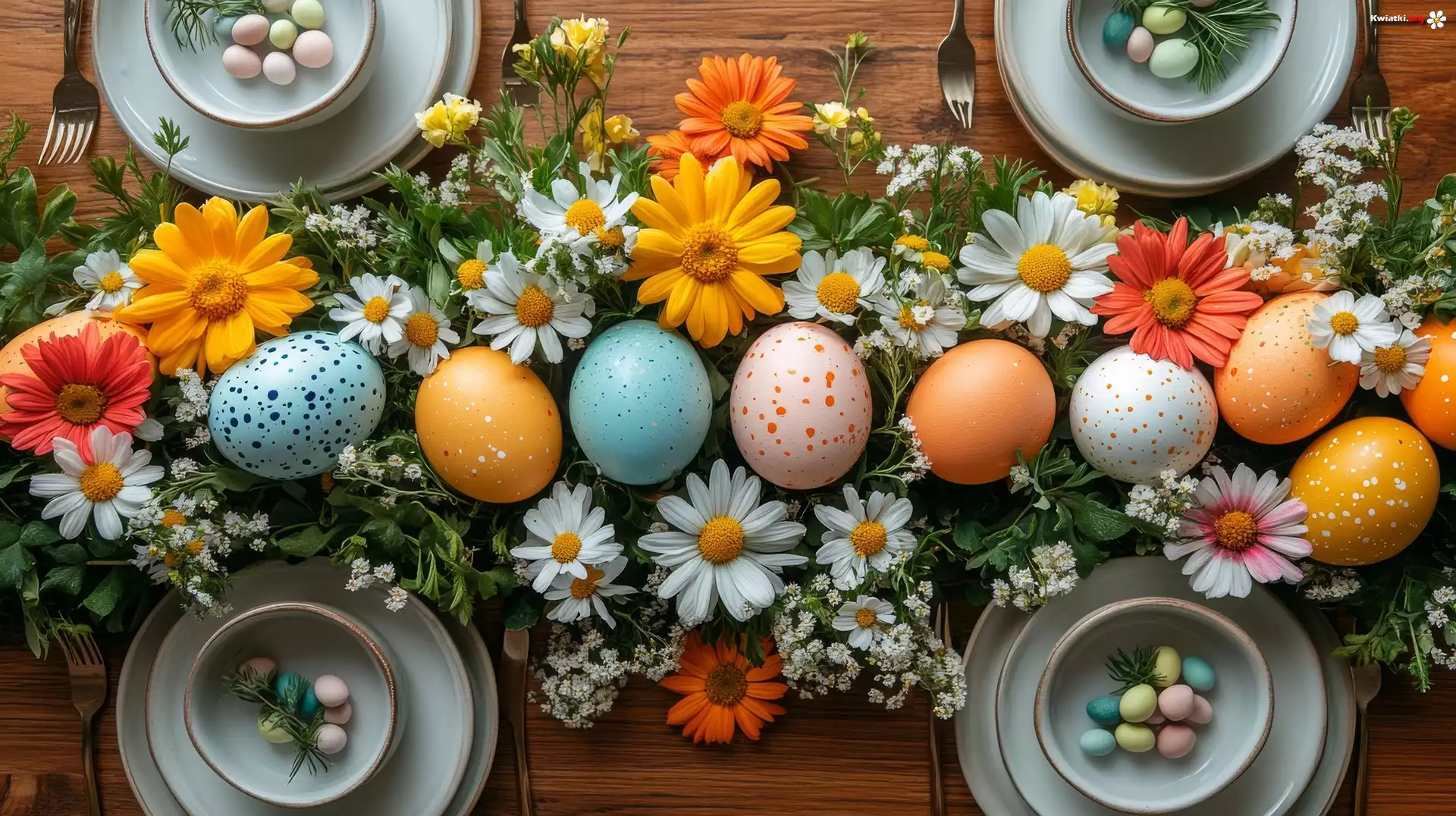 Wielkanoc, Kolorowe, Pisanki, Kwiaty, Kompozycja, Stół, Grafika - Zdjęcia