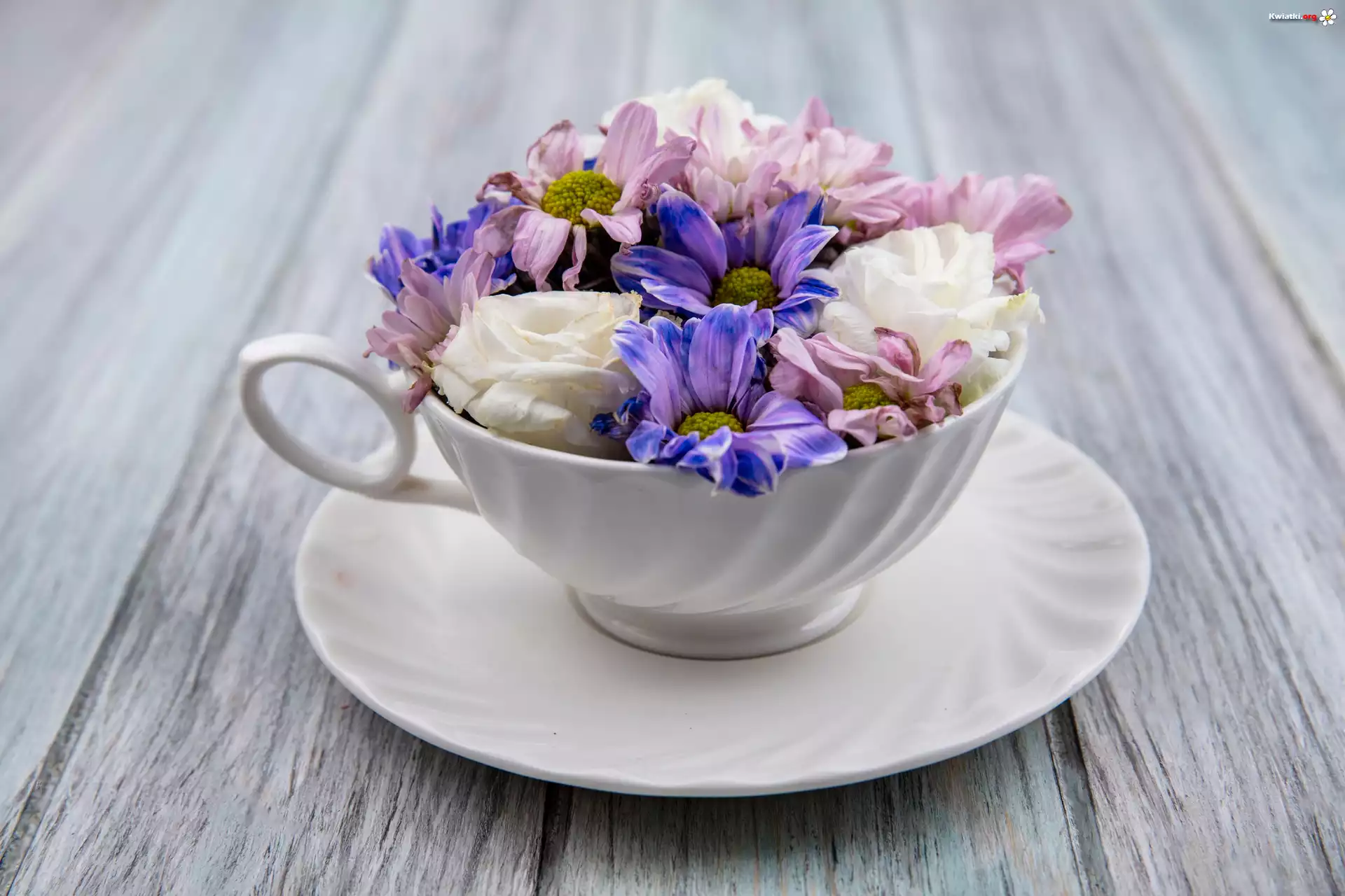 Kwiaty, Filiżanka, Spodek, Podłoże, Drewniane - Zdjęcia