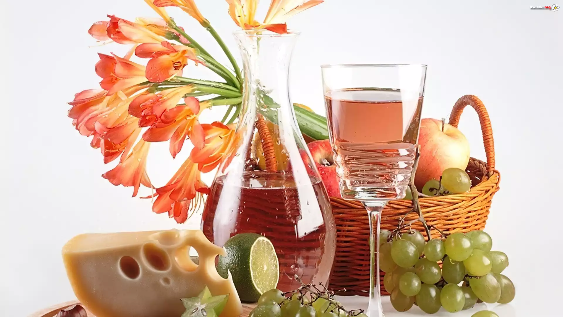Pomarańczowe, Kwiaty, Wiklinowy, Kosz, Winogrona, Ser, Wino - Zdjęcia